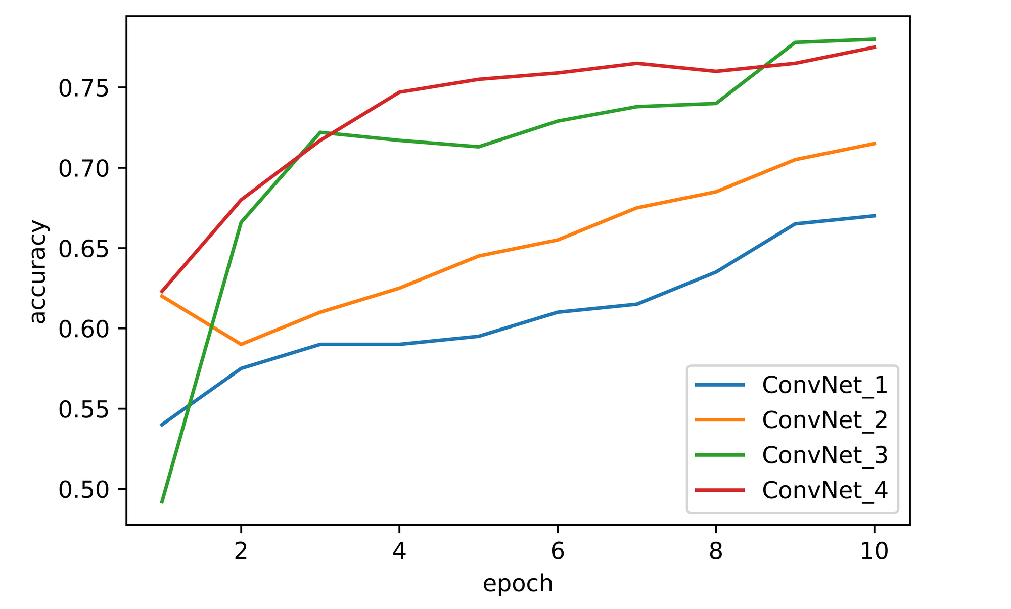 training_set=training_set, validation_set=validation_set)Just like the previous two convnets, an overall increase in both training and validation accuracies was observed throughout the course of model training. Validation accuracy attained after one epoch was about 49%, significantly lower than convnet_1 by five percentage points at the same stage. Performance however rebounded and increased sharply to about 72% by the third epoch after which it fluctuated before eventually settling at just under 80% by epoch 10, completely eclipsing convnet_1's performance.