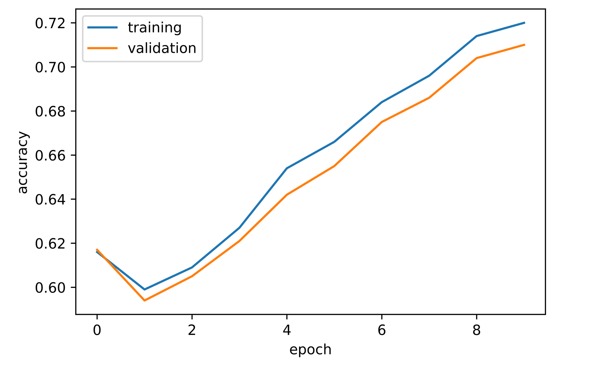 training_set=training_set, validation_set=validation_set)Overall, both training and validation accuracy increased throughout the course of training. Validation accuracy was about 62% after just one epoch, 8% higher than convnet_1 at the same instance. Validation accuracy did dip to just under 60% by the second epoch but it recovered and continued to increase to a zenith of just under 72% by epoch 10, about 5% higher than convnet_1 at that point.