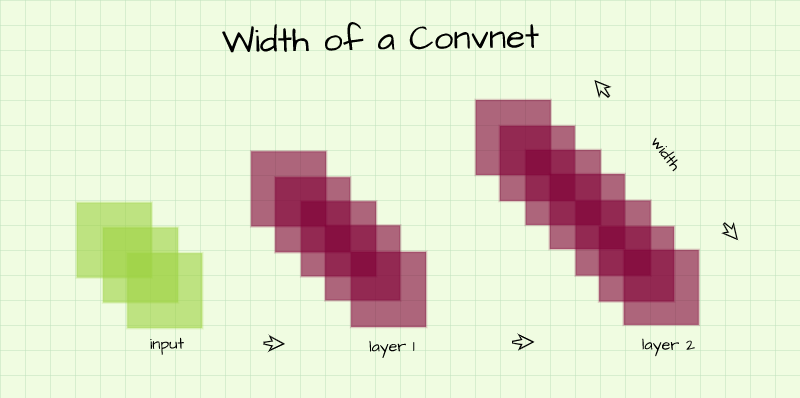 Also known as capacity, the width of a convolutional neural network refers to the number of channels present in its layers. In a typical convnet architecture, the number of channels in each layer increases progressively as we go from one layer to the other, following the same line of thought, this implies that the network gets wider and wider as we go from one layer to the other.