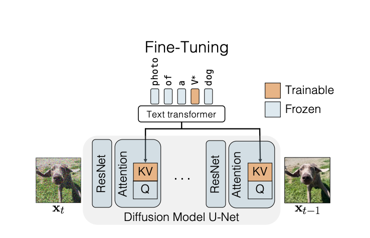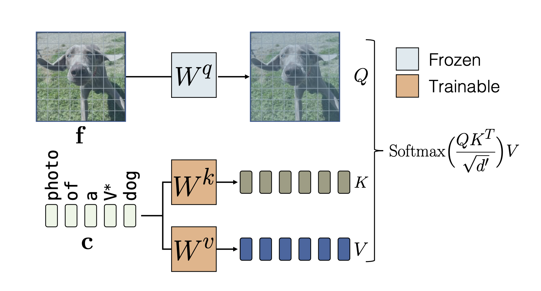 In short, their method for model fine-tuning works by only updating a small subset of the weights in the cross-attention layers of the model. At the same time, a regularization set of real images to prevent overfitting on the few training samples of the target concepts.