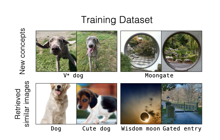 To elaborate, when given images of new concepts, the model retrieves real images with similar captions as the given concepts. It uses these images to create a training dataset for fine-tuning. Above is an example of concepts and their corresponding images.