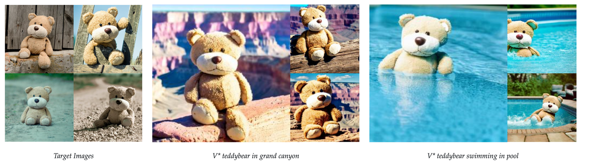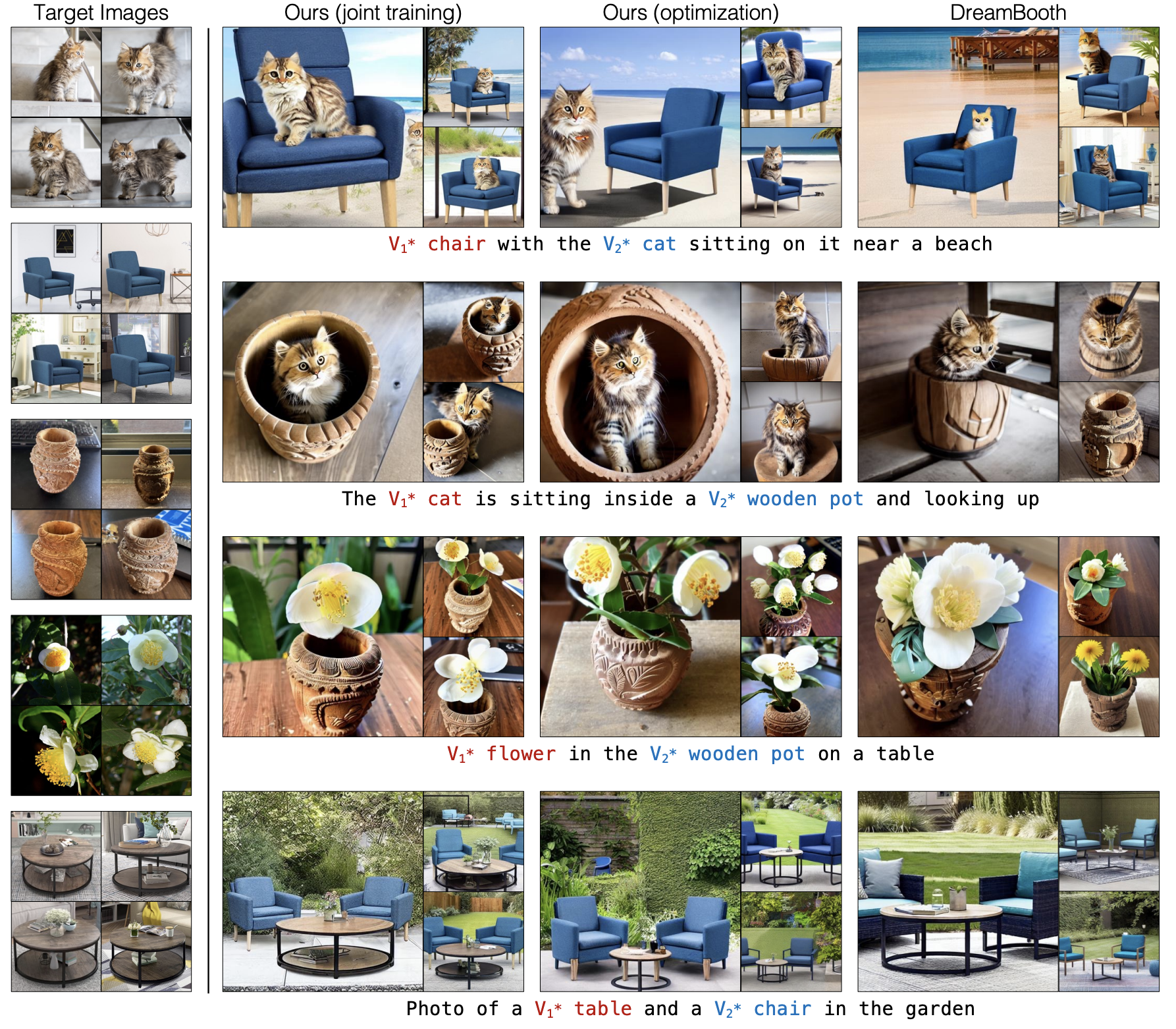 In order to learn multiple concepts, Custom diffusion takes in each individual concept, and works to train on them jointly and concurrently with the same model. To denote the separate target concepts, they recommend the use of different modifier tokens, V∗i . These are initialized with different rarely-occurring tokens to optimize them, along with cross-attention key and value matrices, for each layer. In practice, this allows the model to simultaneously learn multiple concepts with very little loss in capability, and then combine these two subjects as desired during synthesis with the features known to the pre-trained model.