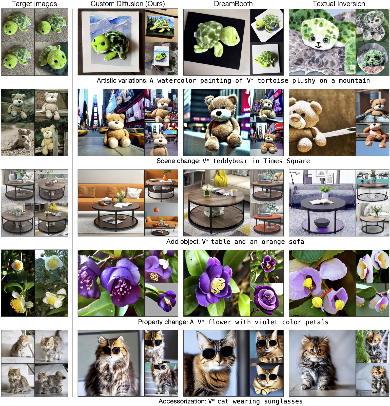 Released to the public last month by Adobe Research, Custom Diffusion is an efficient method for augmenting existing text-to-image models. We find that only optimizing a few parameters in the text-to-image conditioning mechanism is sufficiently powerful to represent new concepts while enabling fast tuning. Additionally, we can jointly train for multiple concepts or combine multiple fine-tuned models into one via closed-form constrained optimization. Our fine-tuned model generates variations of multiple new concepts in novel unseen settings.