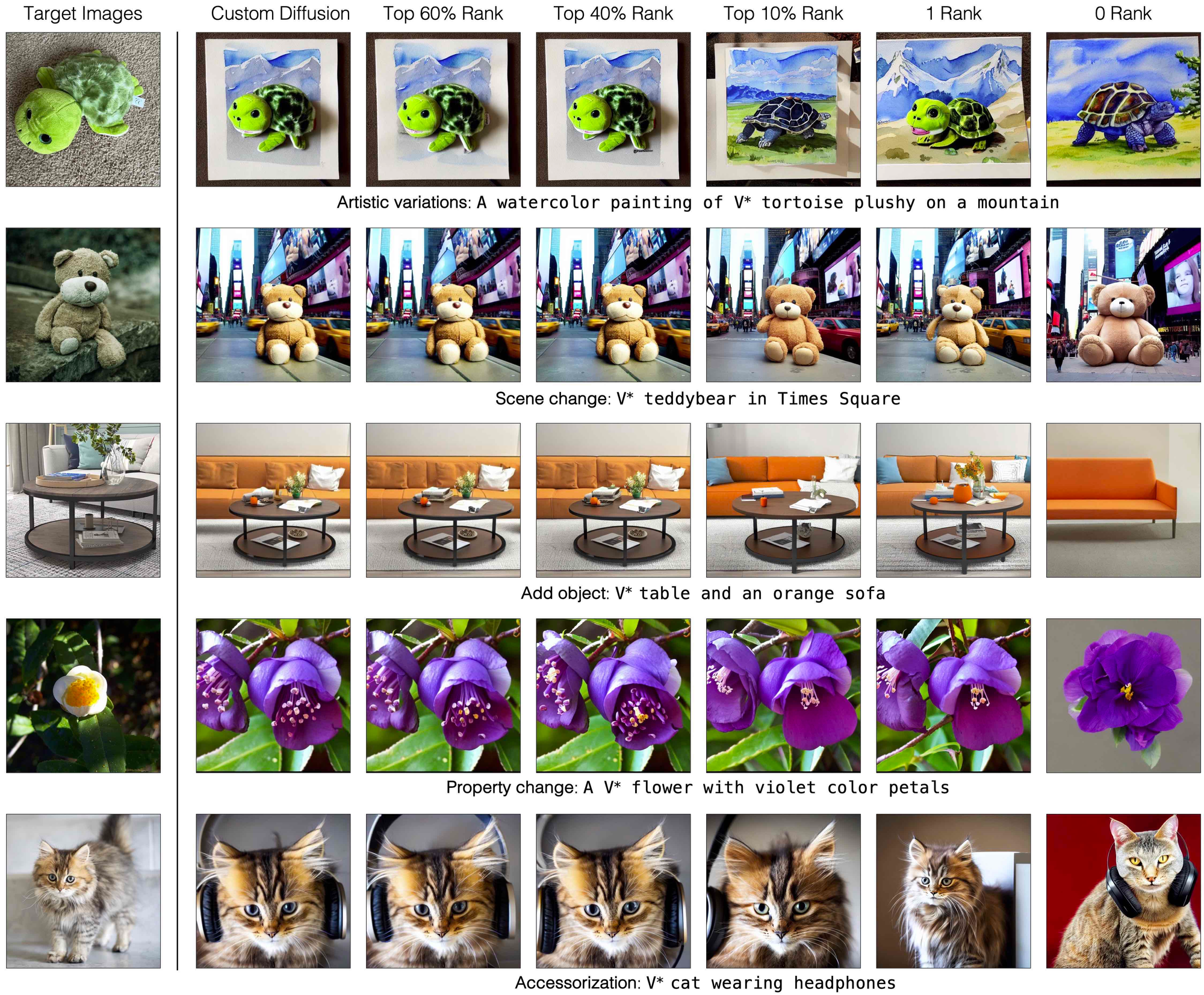 By adjusting the amount we are compressing the image, we can significantly affect the outputs of the Diffusion model. Take a look at the examples below, which use varying amounts of compression on a Custom Diffusion model. The smallest, at 0 Rank, is a model approaching the minimum size of ~15 MB. This new size is orders of magnitude smaller than the original diffusion checkpoints, which can range from 2-8 GB in size.