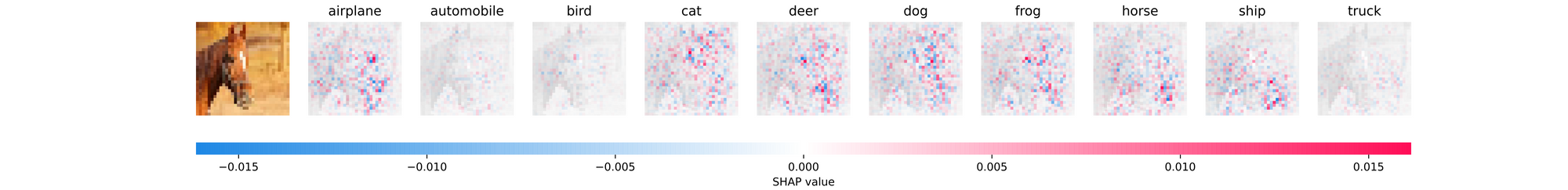 Form the output returned, the model correctly predicts this image instance as a Horse. The ensuing SHAP plot consists of the original image followed by 10 dim grayscale versions of itself. Each grayscale image is indicative of individual classes in the dataset and is labeled as such. Beneath the plot is a scale which reads from negative to positive, color coded from deep blue to bright red. This scale helps to show the intensity of the SHAP value assigned to each pertinent pixel.