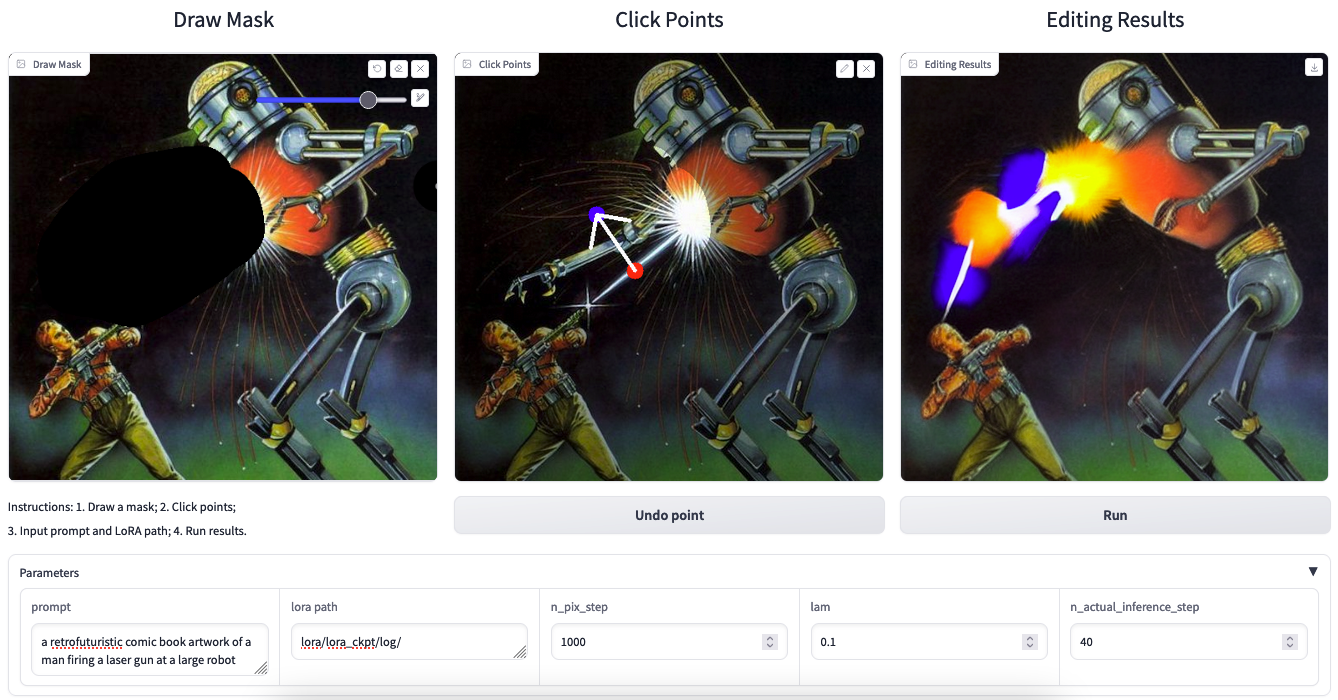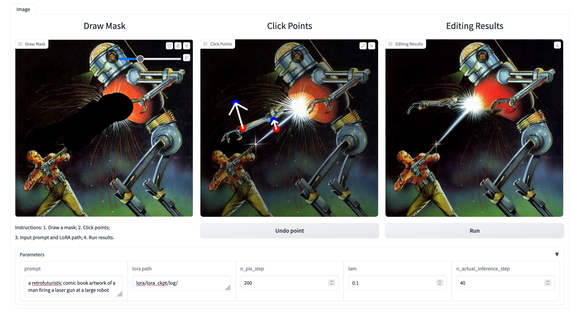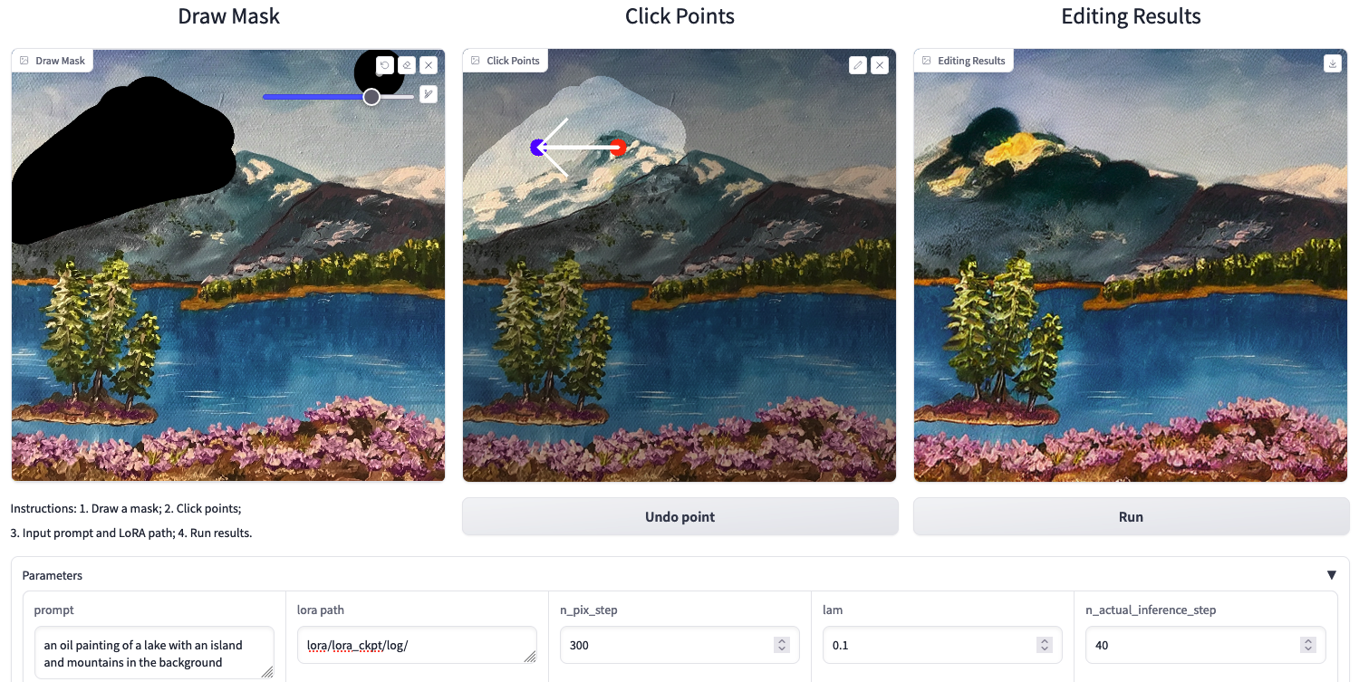 test_ckptdirectory with the trained LoRA. The value islora/lora_ckpt/test_ckpt/. - Finally, we have the n_pix_steps field. This exhibits a huge amount of control over the final output. Increasing the value should significantly affect the models ability to displace the features in the manner described by the click points. We recommend raising this value to 200