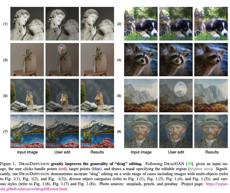 As we described before, the process for actually implementing the drag effect involves displacing features contained within a masked region between user assigned handle points and target points. This enables a wide variety of effects when working on editing images. The most simple of these be single handle to target point movements. For example, turning a head in a portrait or extending the foliage of a tree further in a specific direction. If we apply multiple handle and target points, the model is capable of more complex movements and/or multiple features being displaced or edited.