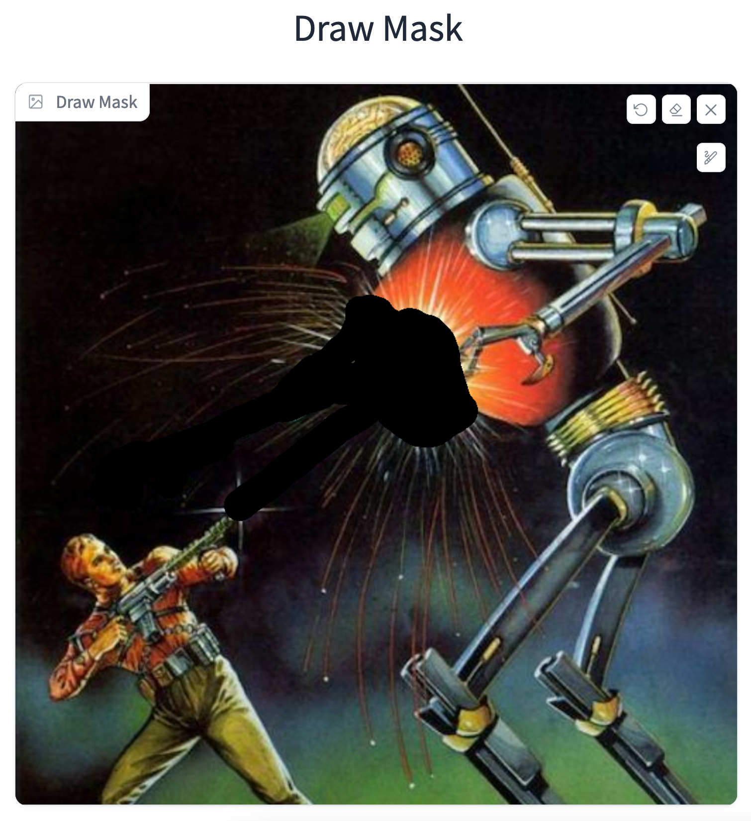 Now, let's upload our image and draw the mask. Be sure to not draw the mask over too much of the empty region between the arm and the laser. We want to reduce the amount of latent space that is being considered by the image manipulation so that the features are less muddled. Below is an example of how we did it: