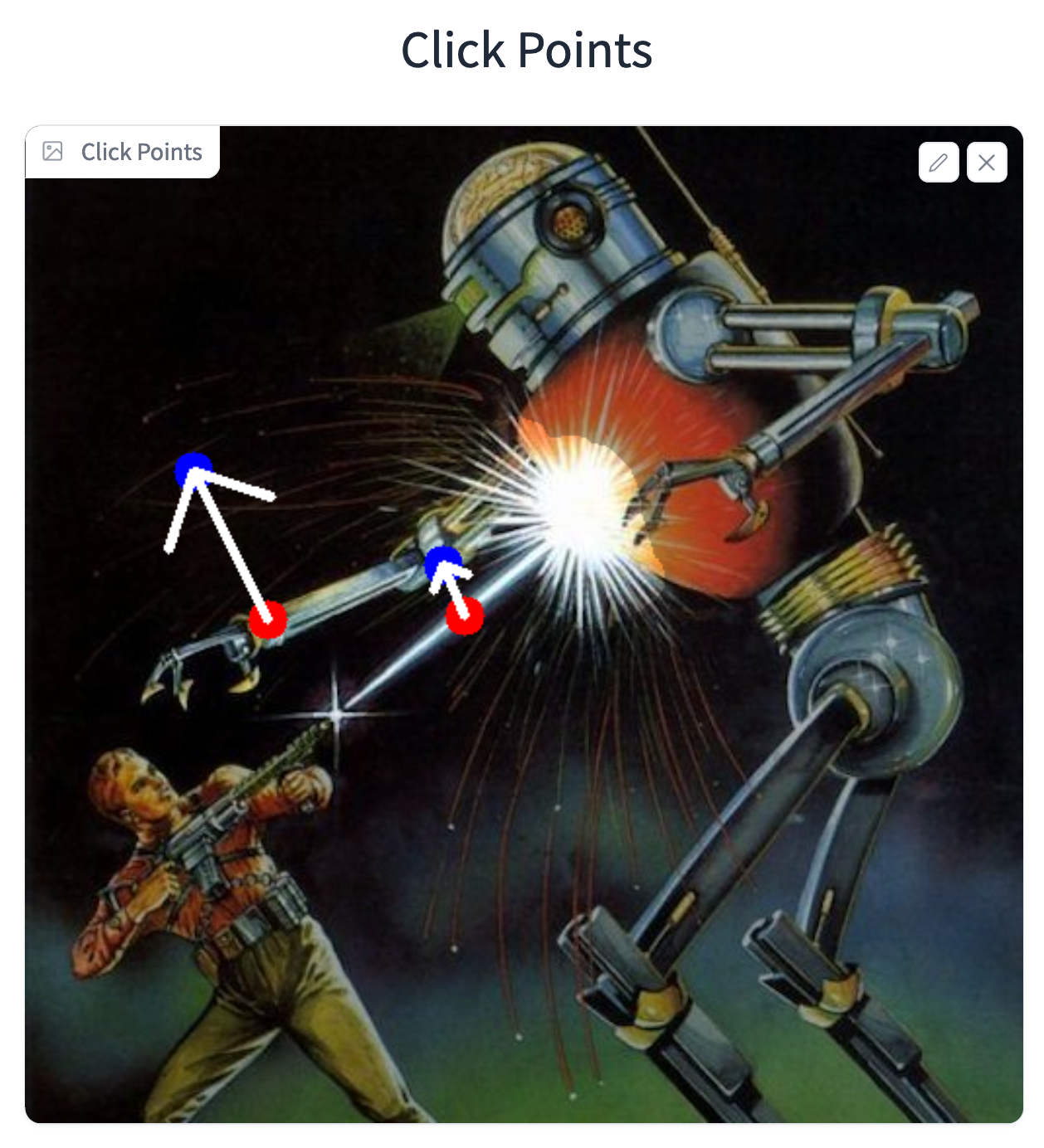 - Click Points: Once we have our image and mask setup, we can create the click points. We first assign the handle point near the features we desire to move around, and then assign the target point at the location we want to shift the features towards