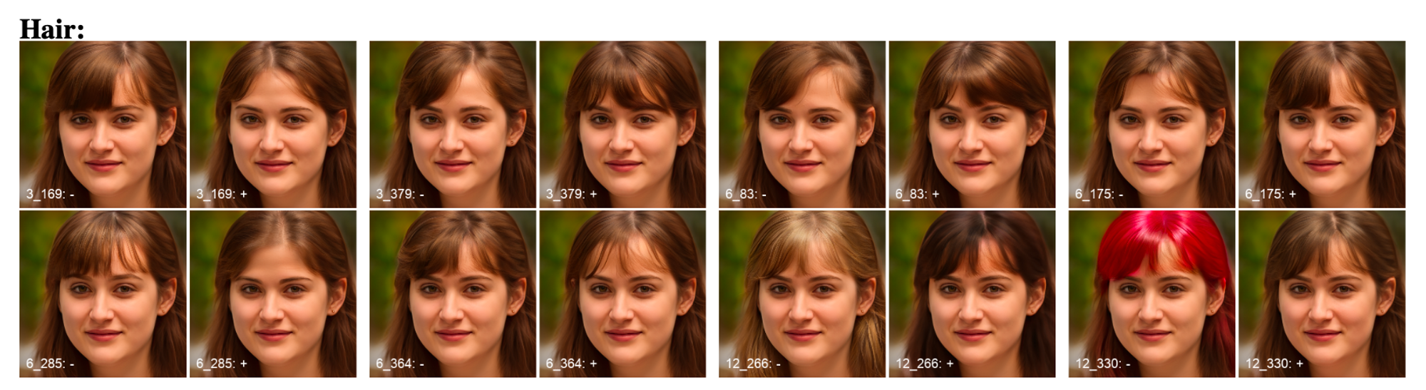 In the image above, style channels that affect portions of the hair region have been determined and are represented by the number on the lower left part of the image. For every channel $x$, there is a pair of images with the channel values $+x, -x$. The difference between the images produces by the channels $+x, -x$ shows the specific region that channel $x$ has altered.