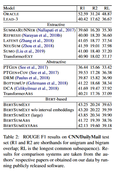 - BERT models collectively outperform all previously proposed extractive and abstractive systems, only falling behind the ORACLE upper bound. Among BERT variants, BERTSUMEXT performs best which is not entirely surprising;