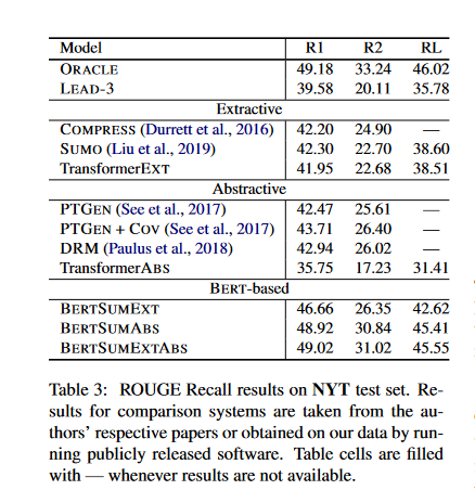 - For comparison to their own model, they also implemented a non-pretrained Transformer baseline (TransformerEXT) which uses the same architecture as BERTSUMEXT, but with fewer parameters. It is randomly initialized and only trained on the summarization task.