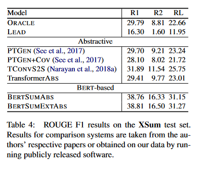 - Table 2 summarizes the results on the CNN/DailyMail dataset. The first block in the table includes the results of an extractive ORACLE system as an upper bound. They also present the LEAD-3 baseline (which simply selects the first