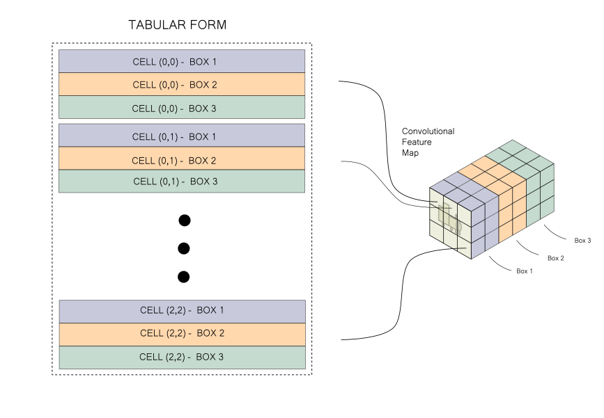 Consequently, the number of columns in our target data structure would be equal to box_info_length (85) since we need to describe one box per row. Re-plugging the image showing the transformation that needs to be performed for your reference here.