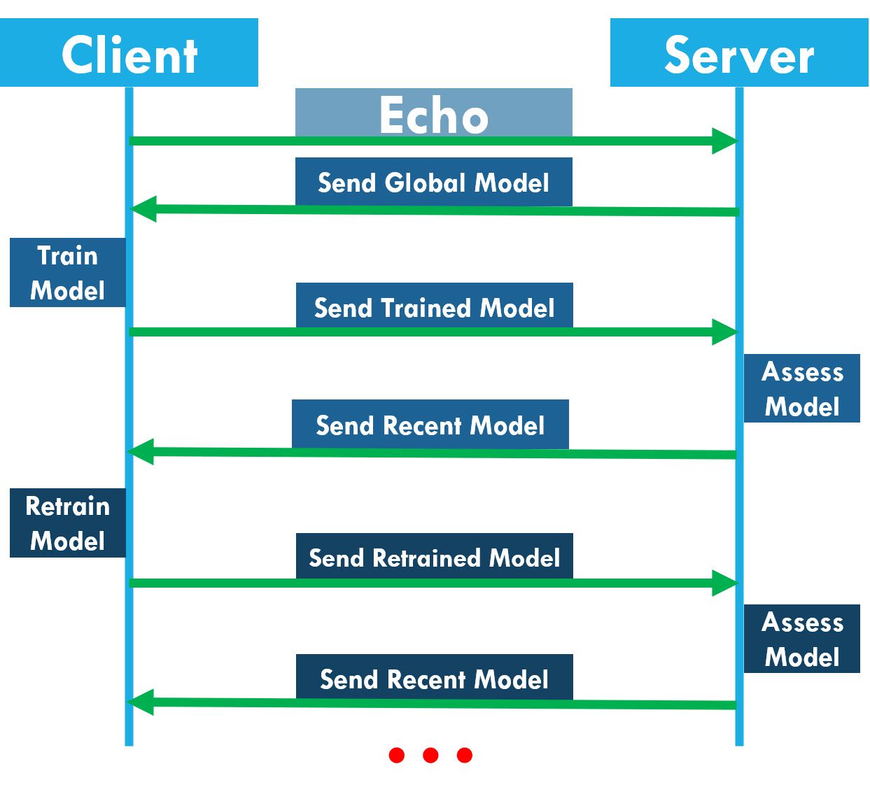 The client trains the model based on its local data and sends the trained model to the server. The server assesses the model based on its test data. If the server decides that more training is needed, the server responds with the most recent copy of the model to the client. This process continues until the server marks the model as trained. At this time, the connection between the client and the server closes.