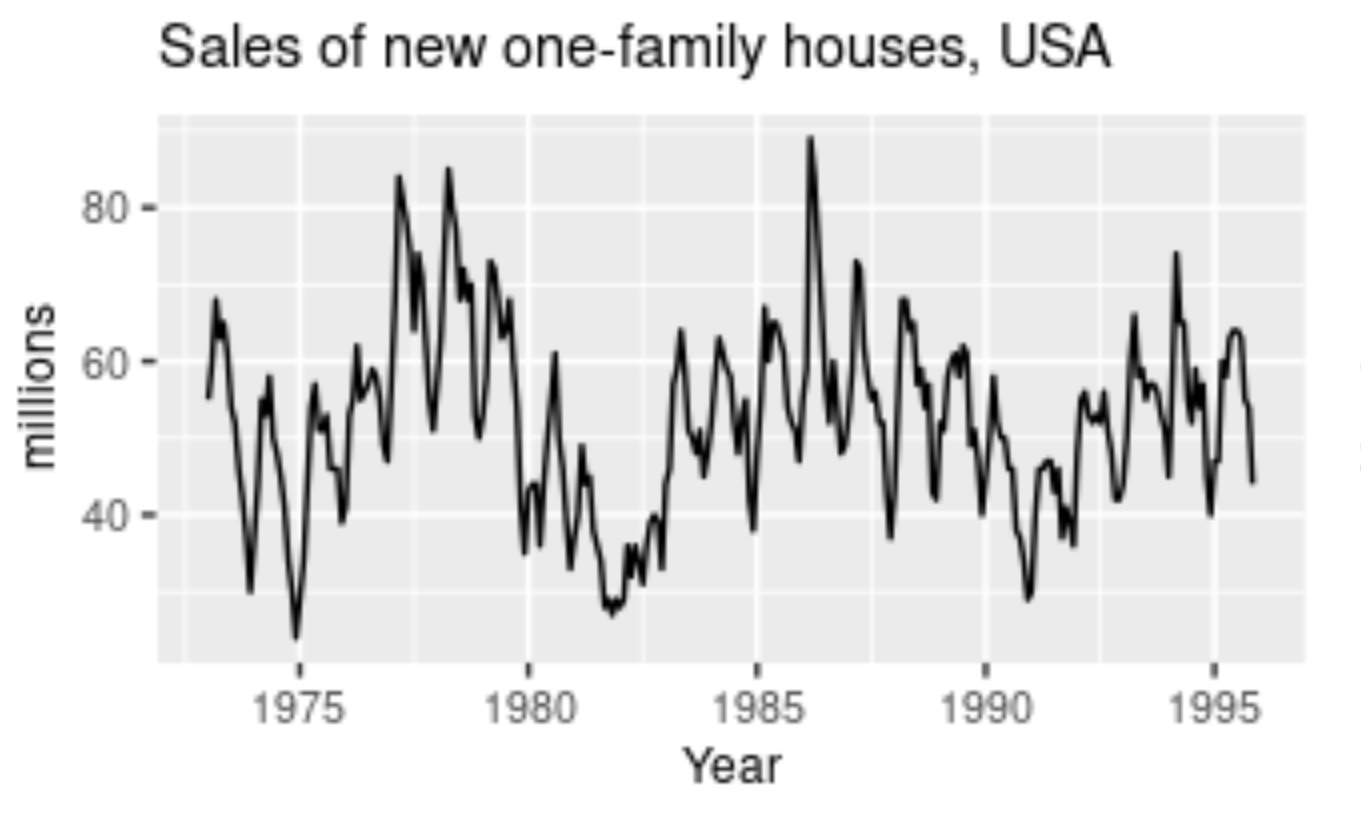 When a pattern exhibits a rise and fall of mixed frequencies, and the graphical representation has peaks and troughs that occur randomly over a period of time, it is called a cyclic component. The duration of these occurrences usually ranges over the period of at least one year. Stock prices of certain companies that are hard to predict usually have cyclic patterns where they flourish during a certain period, while having lower profits at other times. Cyclic trends are some of the hardest for our deep learning models to predict. The graphical representation above shows the cyclic behavior of house sales over the span of two decades.
