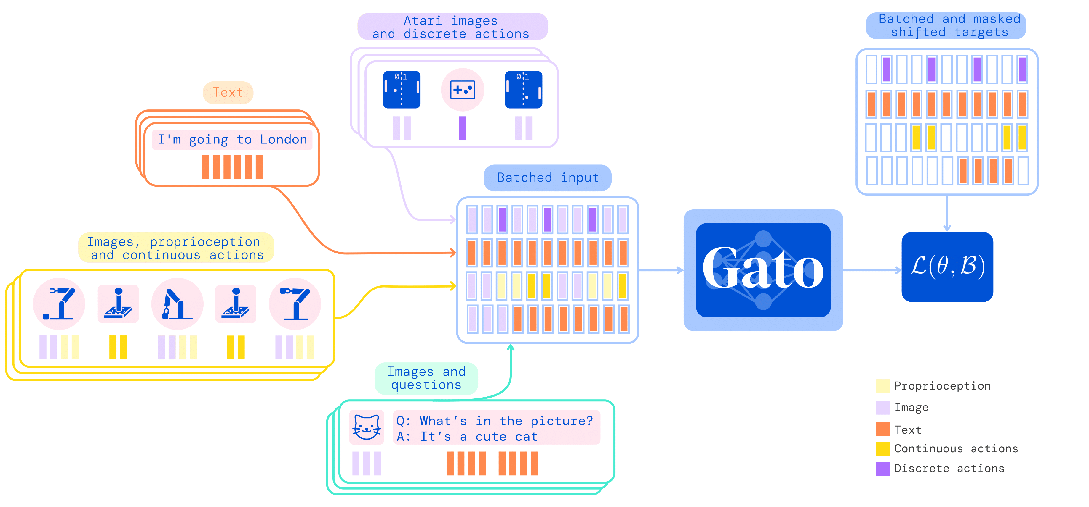 Examples of discrete and continuous values respectively are button presses when playing a game, and proprioceptive inputs. In total, Gato was trained on 604 different tasks.