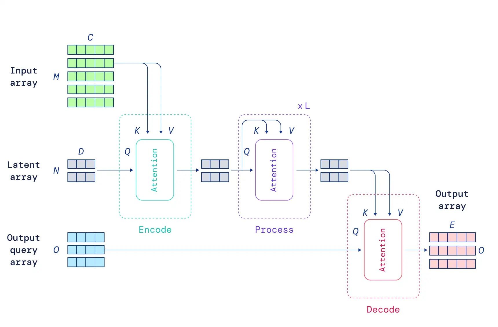 The diagram from the original DeepMind blog shows a useful overview of the Perceiver setup: