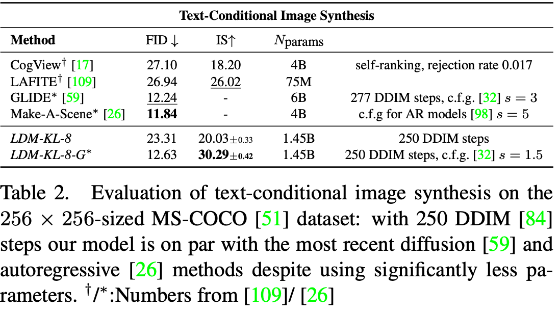When acting on these tasks, Stable Diffusion is considered to be SOTA in terms of synthesis capability. As we can see from the table above, when performing a text-conditional image synthesis task, the predecessor to Stable Diffusion (Latent Diffusion) was able to achieve comparable FID scores to two of the top image synthesis model frameworks, GLIDE and Make-A-Scene. Furthermore, the LDM-KL-8-G was able to achieve the highest Inception Score (IS) of all the tested models. Based on this data, we can infer that Stable Diffusion is an extremely powerful image synthesis tool with accurate recreations. These findings are also reflected by the model when performing other tasks, indicating the model's general robustness.