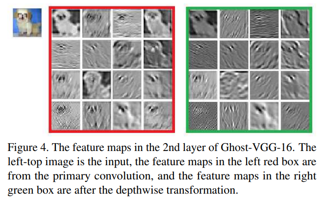 Further, the authors visualize the difference observed in the feature maps generated by standard convolutional layers and ghost convolutional layers for the 2nd layer in a VGG-16 Ghost Network, as shown below. Ghost convolution reduces the spatial redundancy and creates a unique set of feature maps with richer representations.