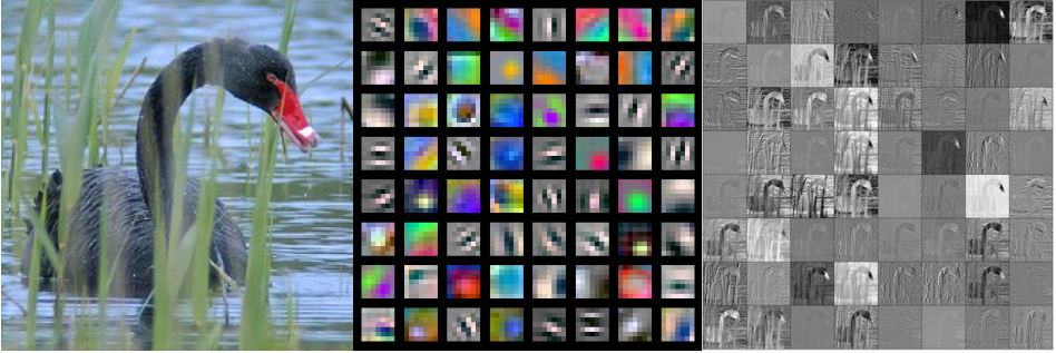 These filters/kernels, also termed as "weight matrices", contain numerical values which are applied to the input image and are tuned by back-propagation to capture intrinsic internal feature representations of the given input image. In general terms, a convolutional layer takes an input tensor of C channels and outputs a tensor of C' channels. These C' channels are determined by the number of filters/kernels present in that layer.