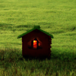 After running all of these steps on a Gradient Notebook, we were able to generate this 256 x 256 inpainting. As you can see, it has managed to capture the spirit of the prompt ("a small house on fire"), by adding the cottage looking portion with a flame shining through the window. It also seems to have identified that the original sample was at an angle aimed towards the ground. The COCO dataset the models were trained on likely didn't have any images of houses at such an angle. To remedy this, a patch of more horizontal grass was added for the cottage to stand on.