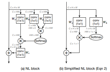 As shown in the above diagram, the NL Block essentially takes in the input tensor and first permutes it from $C \times H \times W \times C \times HW$ dimension format. This permutation is followed by three branches. In one of the branches, it simply undergoes $1 \times 1$ pointwise spatial preserving convolution. In the other two branches, it also goes through similar convolution operations but then they're multiplied by the cross product by permuting one of the outputs, after which the resultant output is passed through a SoftMax activation layer which outputs an $HW \times HW$ shaped tensor. This output is then multiplied by the cross product with the output of the first branch to give a resultant $C \times HW$ output, which is then permuted to a shape of $C \times H \times W$ before being element-wise added to the original input to the block like a residual connection.
