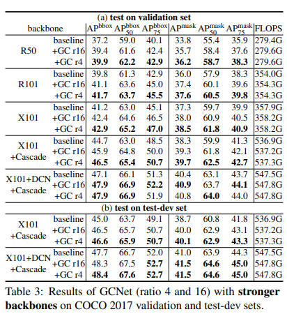 As observed, GCNet provides very strong results and considerably large performance improvements over the baseline counterpart. This is attributed to GCNet's capability to model pixel-level long-range dependencies and concurrently map channel-wise attention.