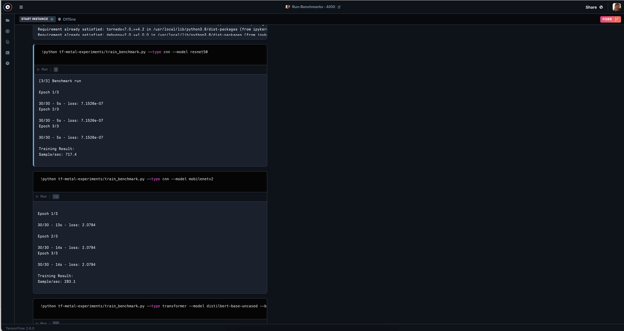 !python tf-metal-experiments/train_benchmark.py --type transformer --model bert-large-uncased --bs 4Your results will output like so in samples/second: