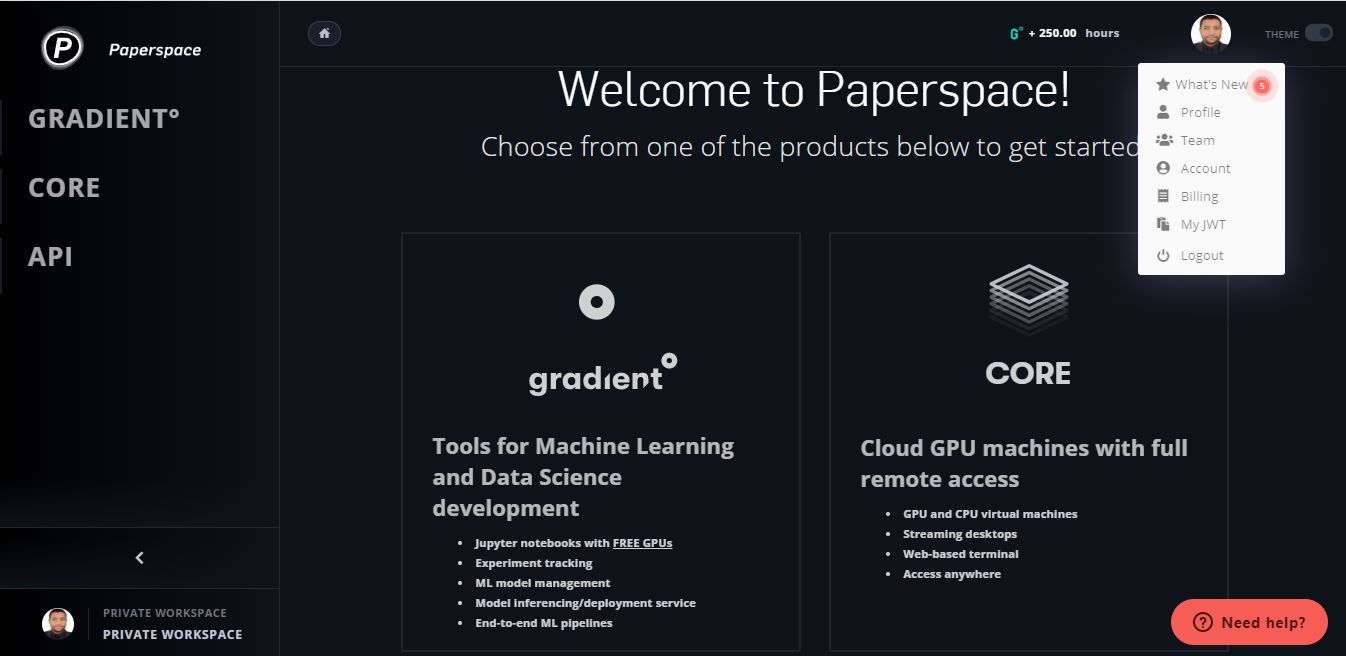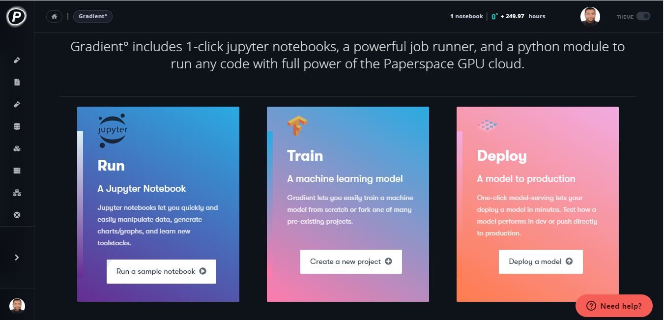From the Paperspace console page click on Gradient on the navigation bar to the left. You will then be directed to the Gradient console. The recommended first steps are to: