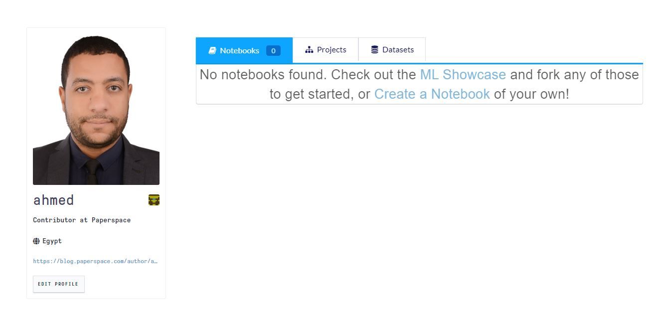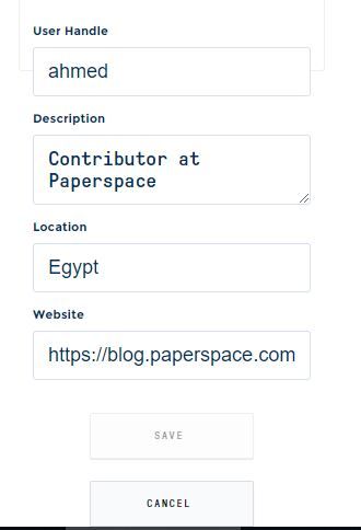 At the bottom-left of the page there is an EDIT PROFILE button, which you can click to enter your details. You can also click the profile photo to change it. Your User Handle will be used in your account page URL. I used ahmed, and thus my Paperspace profile URL is https://www.paperspace.com/ahmed. Finally, click the SAVE button to save your details.