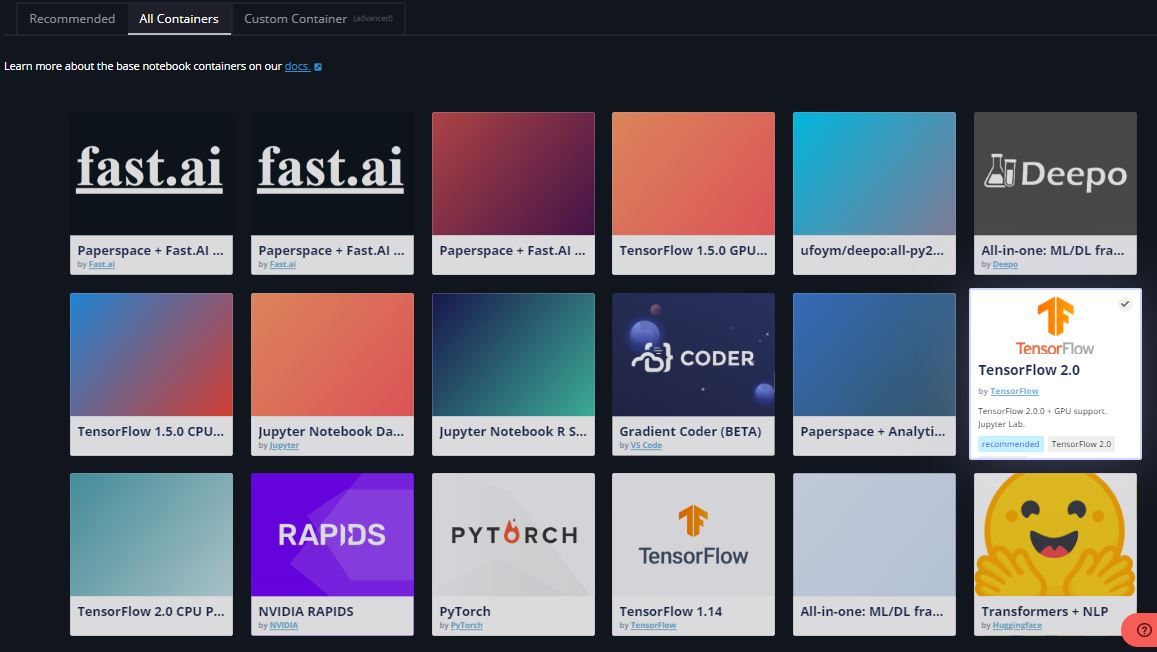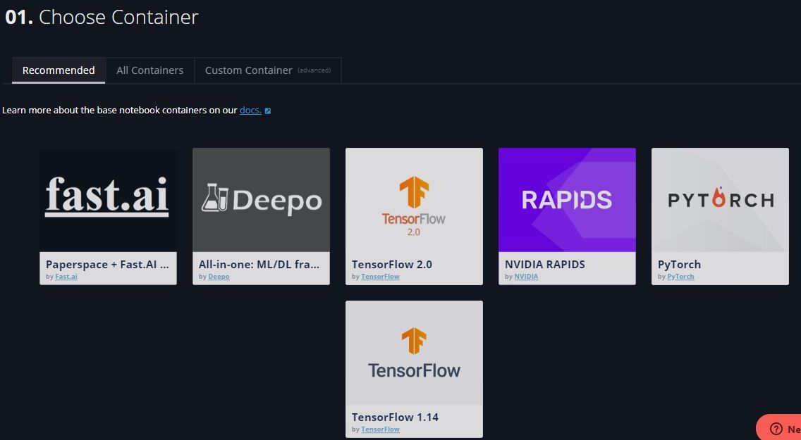 Paperspace Gradient runs Jupyter notebooks inside a "container", which is an environment prepared with all of the required dependencies for running the notebook. There are a total of 18 pre-configured containers available, and you can also use a custom one. Visit this page for more information about the supported containers.
