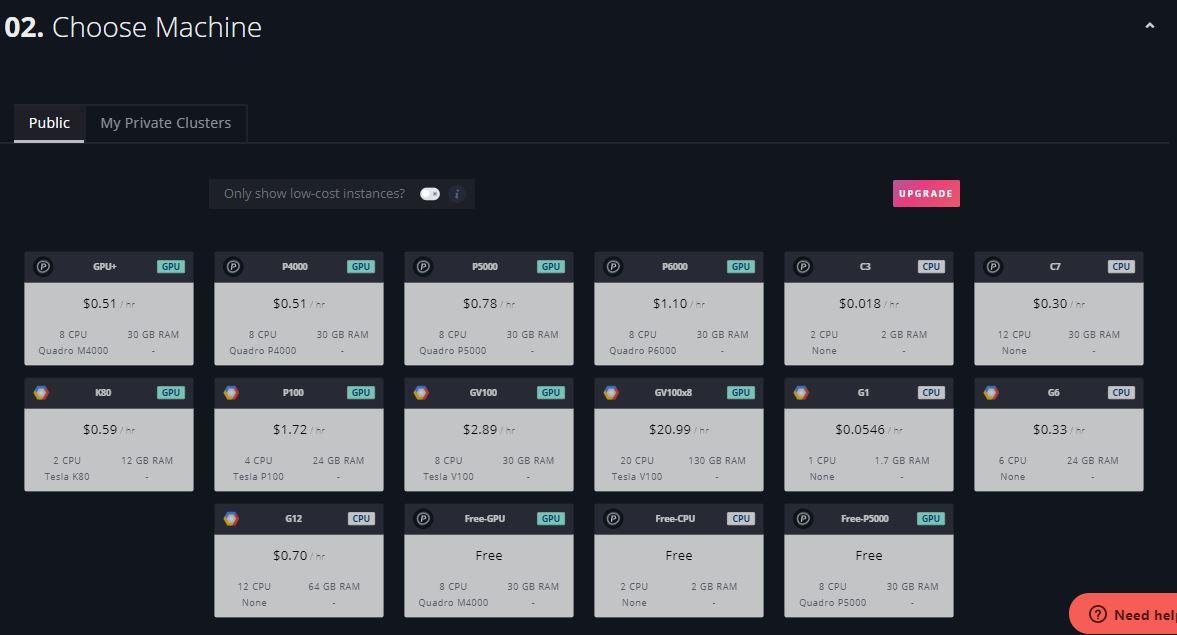 The "All-in-one" is a good container to start with since it has all of the dependencies pre-installed for all major machine learning/deep learning frameworks. After you select the container, we'll need to choose a machine.