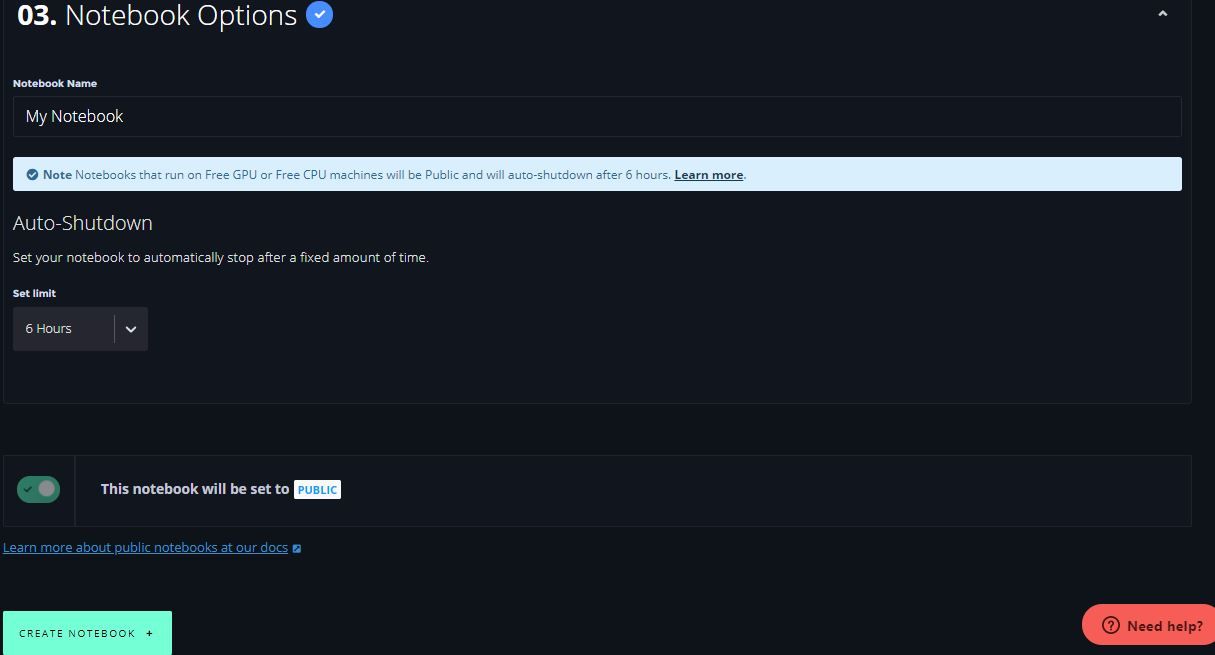 These two options are not editable for the free instances, as you can see in the next figure. A notebook running on a free instance will always be set to public, and will shut down automatically after 6 hours. For a paid instance, you can freely change both.