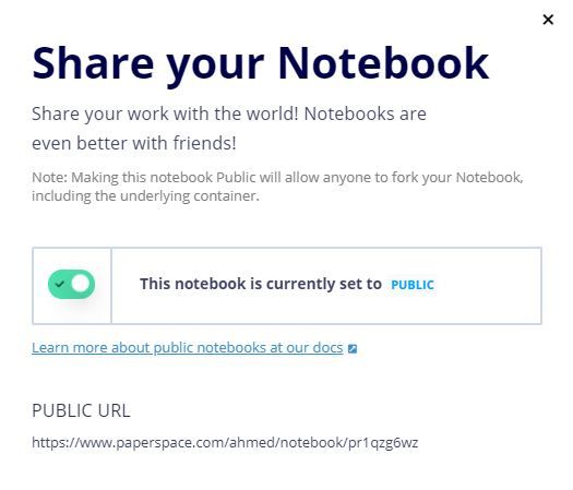 Within the actions, you can click the SHARE button to share your notebook. This will bring up a window, shown below. At the bottom of the window you can click the link to copy the public URL of the notebook, which in this case is https://www.paperspace.com/ahmed/notebook/pr1qzg6wz. Being public, anyone with the link can view the notebook without even creating a Paperspace account. Just visit its link and enjoy it! For more information about viewing a notebook, visit this page.
