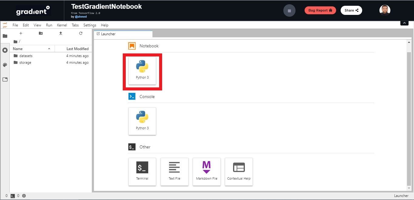The next figure shows the result after opening the notebook in the beta version for the first time. Because this is the first time you've opened your notebook, a launcher will be open asking you whether you want to open a notebook, console, terminal, and so on. In this case, we are interested in creating a Python notebook and thus the first option is selected. Note that only Python 3 is supported.