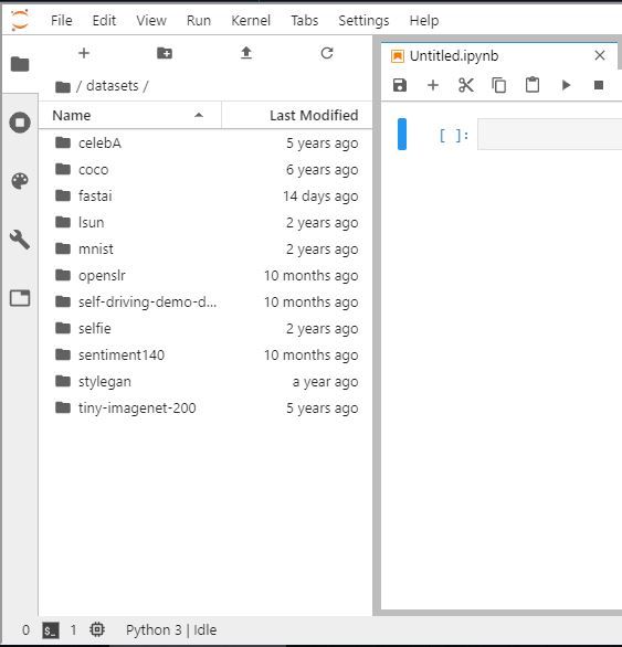 The File Browser can be used to navigate through the storage associated with the notebook. In addition to your Jupyter notebook (.ipynb) file, there are two others folders. The first is called datasets, and it contains a number of pre-loaded ML/DL datasets which you can see below. This saves you from the time and effort of having to download these yourself, and this storage is included in your free environment. You can navigate through each of the subfolders easily to see their contents.