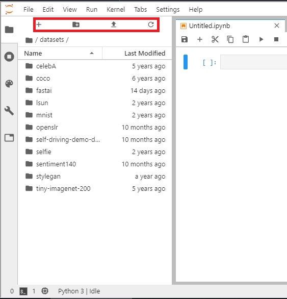 - New Launcher: Opens the launcher that we saw previously when we first opened the notebook. Can be used to create new documents.
