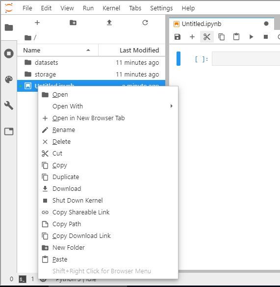 You can also right-click a file to open a list of additional options. The next figure shows the result after right-clicking the notebook file. You can find options including open, delete, copy, cut, download, and rename. You can also right-click a folder for more options like these.