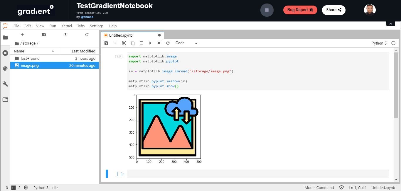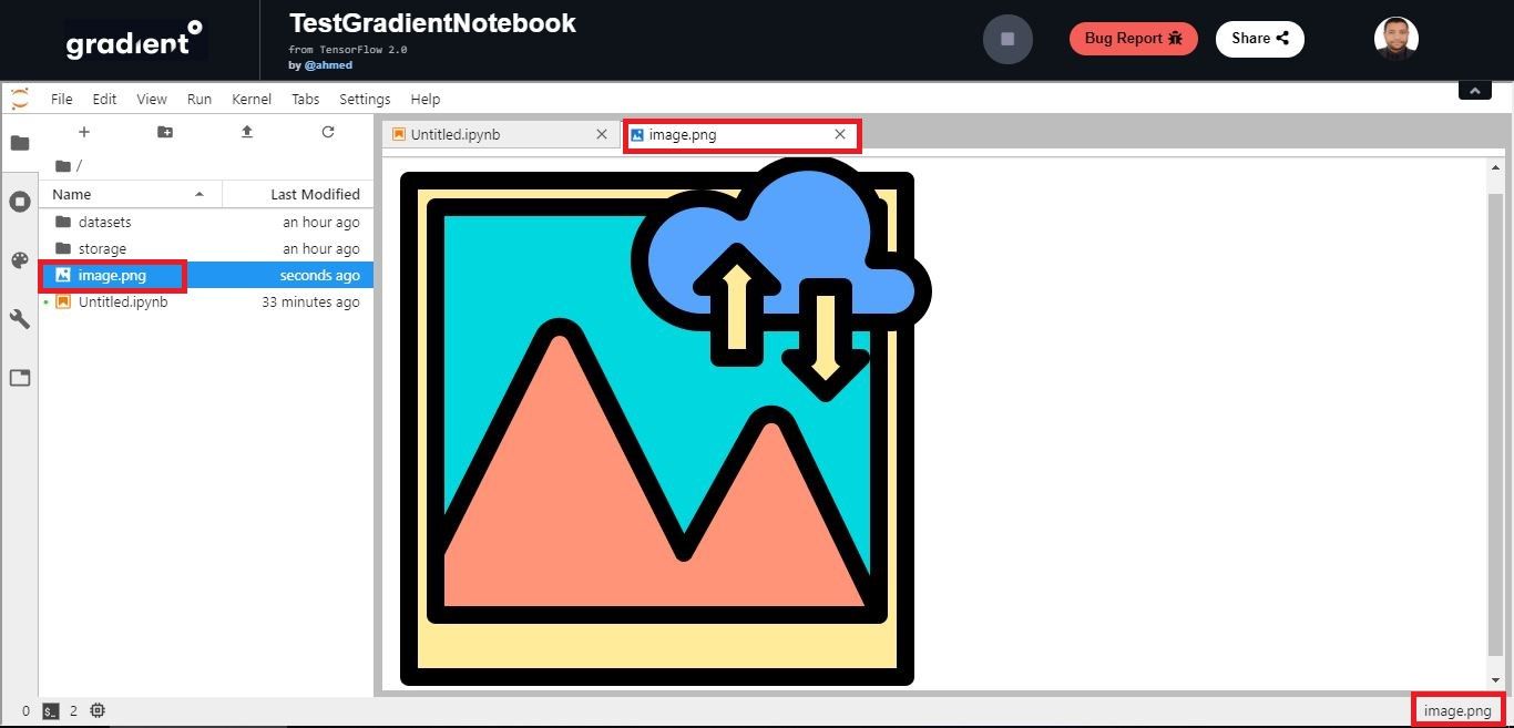 Clicking the Upload Files icon in the File Explorer window allows the user to select files from their local storage and upload them to the notebook storage. The next figure shows that an image is uploaded to the current directory and opened in a new tab.