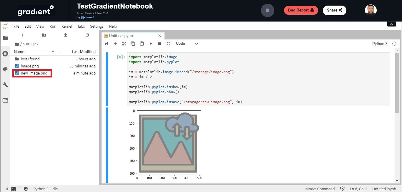 matplotlib.pyplot.imsave("/storage/new_image.png", im)The next figure shows that the image is successfully saved to the /storage directory.