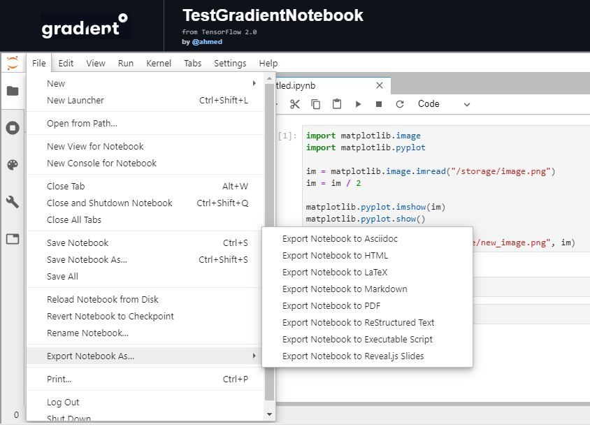 After you finish working, you might be interested in saving a static version of the notebook. You can do that easily with Gradient notebooks. According to the next figure, go to the File menu and click on the Export Notebook As. You can find different options to export the notebook including Markdown, PDF, LaTex, and HTML.