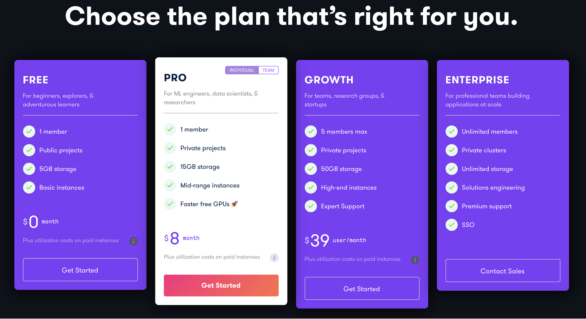 Gradient has three pricing tiers available to the individual customer, with increasing amount and quality of free GPU's available at each tier of pricing. The first paid tier expands access to 3 new, free GPU types and 15 GB of storage for $8/mo.
