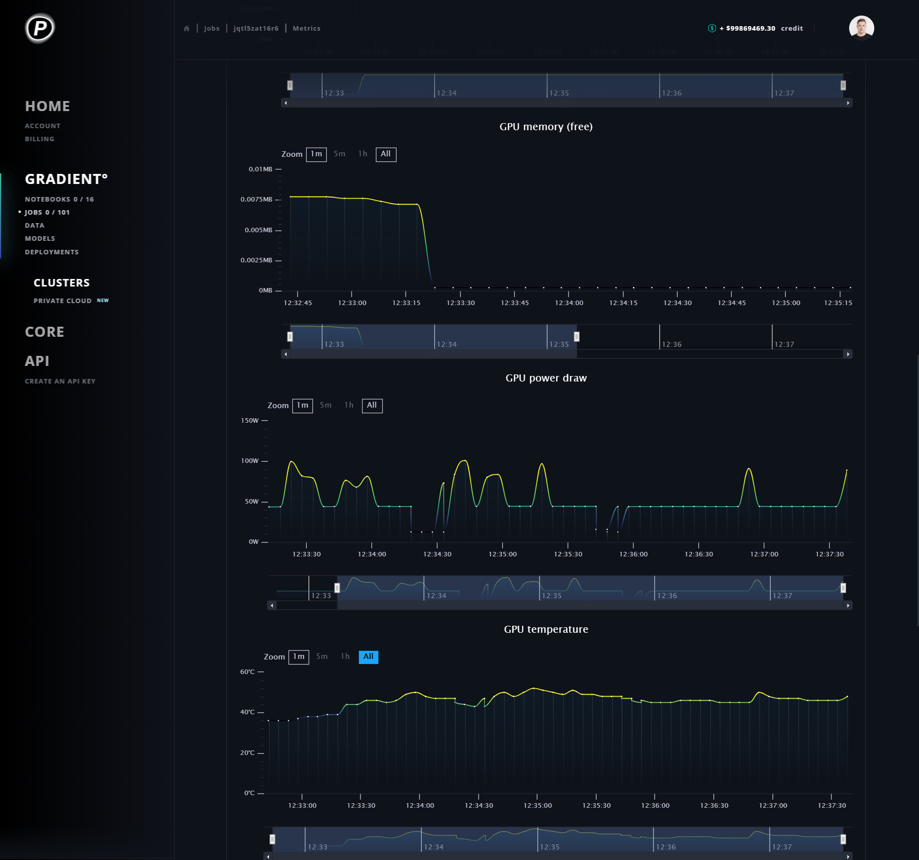 Now whenever you run a job you can watch in real-time the host metrics including GPU Utilization (%), GPU Memory Used, Temperature, and Load. You can also see CPU and RAM utilization as well to ensure that your Gradient job is performing as expected.