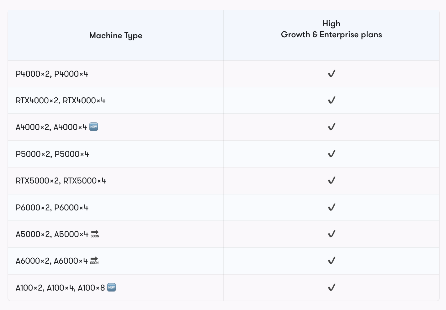| GPU | Yes, P100 | Yes, M4000, P4000, RTX4000, A4000, P5000, RTX5000, A5000, A6000, V100 - 16GB, V100 - 32GB, A100 - 40GB, A100 - 80GB |