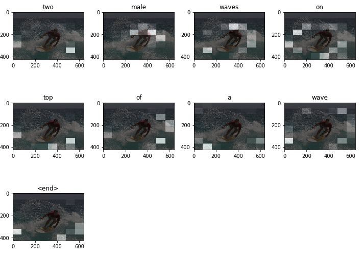 Pay close attention to the image with "male" above it. You can clearly see that most of the white boxes are clustered on the man on the surfboard with different intensities. These white boxes are an indication that the network is paying attention those regions in the image; the greater the intensity, the more attention the network is paying to that area. Decoding the captions uses a greedy search algorithm, shown in the code below. This works by feeding the decoded word at a particular time step as input to the next time step. Further improvement in decoding captions can be introduced by using a beam search decoder which is more robust than the greedy search algorithm, but a bit more complicated to implement. The code for displaying images with overlaid attention weights is also included below.