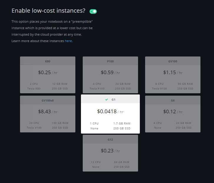 For more details on Gradient Low-Cost instances, please check out the Help Center. For more pricing information, take a look at our Gradient pricing page.