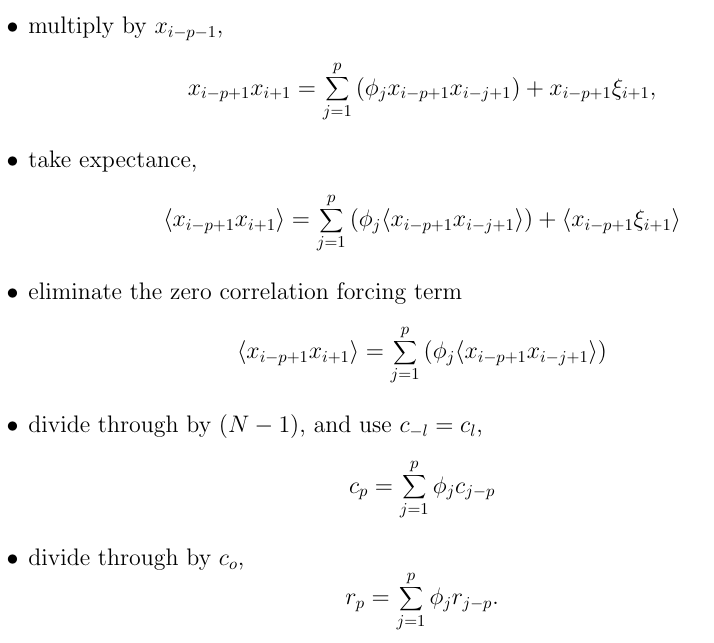 The equation is multiplied by the element at the maximum lagged time step and the expectation is calculated. The equation is divided by the length of the series, then by the zeroth autocovariance.