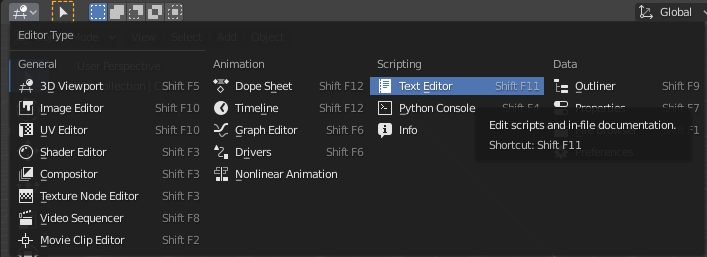 For processing all your actions with Python scripting in Blender, migrate the cursor over to the editor type icon in the top-left of the Blender screen right below the menu bar. If you hold the cursor in the specified location, you will notice that the icon displays that the current editor type for the particular area is a 3-D Viewport generalization where you can manipulate the performance, actions, and operations of objects in a 3-Dimensional space. Click the icon, and you will be greeted with numerous options. Select the text editor option that allows you to edit your Python scripts or any other type of in-file documentation. Check the below figure for further guidance.