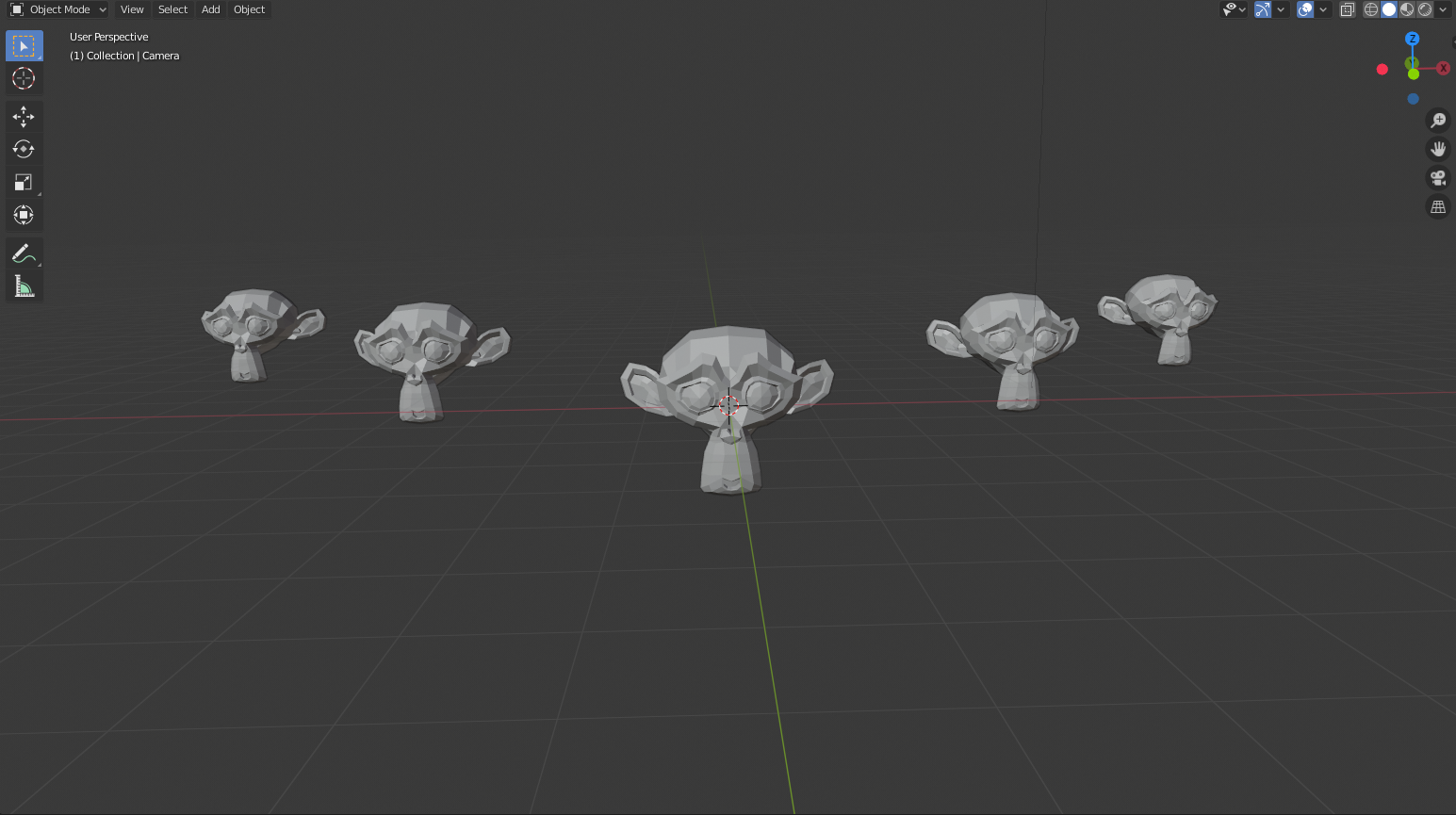 Once the monkey meshes are placed on the blender screen, our next step is to adjust the camera or the object accordingly. Since we have multiple meshes on our screen, the best option is to adjust the camera views to view the positioning of the monkey meshes from different perspectives and camera angles. Click on the camera module in Blender and press 'G' on the keyboard to drag it to a suitable location. Once you drag it to the required location and place it, you can also click 'R' on the keyboard and select the respective axis to rotate the camera around. You can select the 'X,' 'Y,' or 'Z' axis for rotating and placing the camera in the desired position.